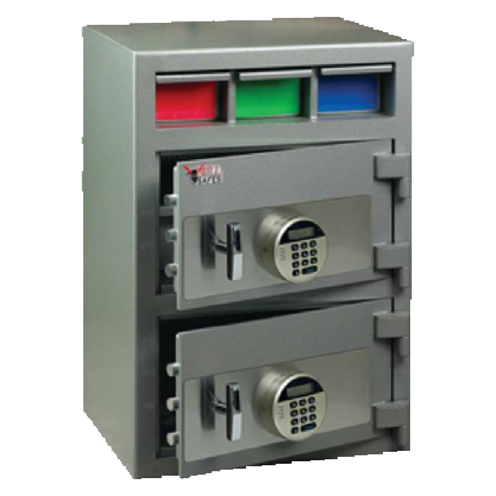 The Blue Air BS3D2EE Bull Safe Depository & Money Manager Safe Digital Lock System is engineered for secure storage and management of valuables, making it a prime choice for businesses in the finance and retail sectors. This dual-compartment safe measures 20" x 16" x 30", providing ample space for organizing different categories of cash and documents. The digital lock system enhances security, ensuring authorized access only. Constructed with three active 3/4" locking bolts and a solid steel dead bar, it offers robust protection against unauthorized entry. Anti-fish baffles are integrated into the design, preventing tampering and ensuring secure deposits. The safe's door is 1/2" thick, complemented by a 1/4" thick solid steel construction, delivering exceptional durability and resistance to forced entry. Heavy-duty hinges further reinforce its structural integrity. Pre-drilled anchor down holes simplify installation, enabling secure attachment to floors or walls to prevent removal. The Blue Air BS3D2EE is tailored for environments where security and reliability are paramount, offering peace of mind to businesses dealing with cash transactions or valuable document storage. Its technical specifications underscore its role as a formidable safeguard for assets in high-security applications.