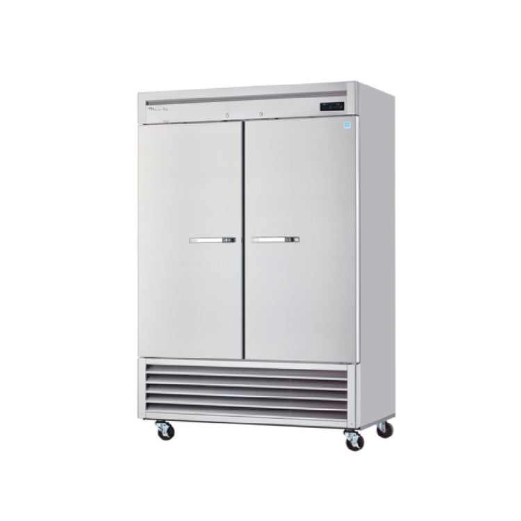 The Blue Air BSR49-HC Refrigerator Reach-in Two-section is engineered for commercial kitchens requiring substantial storage and reliability. With a generous 49 cubic feet capacity, this unit features a bottom-mount self-contained refrigeration system, ensuring ease of access to stored items in its two-section design. The refrigerator is constructed with robust stainless steel for both interior and exterior, ensuring durability and a professional aesthetic. It houses two full-size self-closing solid doors with locking capabilities, equipped with metal handles and a door open alarm for enhanced security and energy efficiency. The unit's interior is illuminated by LED lighting, making it easy to organize and locate items across the eight adjustable wire shelves. The Blue Air BSR49-HC uses R290 Hydrocarbon refrigerant, an environmentally friendly choice, and operates with a quarter horsepower motor on a 115v/60/1-ph electrical connection, drawing 2.4 amps. It includes a cord with NEMA 5-15P plug, ensuring straightforward installation. The inclusion of 4-inch swivel casters, with two braked, allows for easy mobility and secure placement. Certified by cETLus, ETL-Sanitation, and ENERGY STAR, the BSR49-HC is a reliable and efficient choice for varying market segments needing consistent and quality refrigeration solutions.