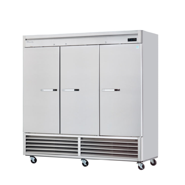 The Blue Air BSR72-HC Refrigerator Reach-in Three-section is a versatile refrigeration unit tailored for commercial settings. With a substantial capacity of 72 cubic feet, it is designed to accommodate significant storage needs. This model features a bottom-mount self-contained refrigeration system, utilizing R290 Hydrocarbon refrigerant for efficient cooling. It is equipped with three full-size solid self-closing doors with locking mechanisms, providing both security and convenience. Metal door handles and a door open alarm enhance the operational efficiency of the unit. Inside, twelve adjustable wire shelves offer flexible storage solutions, while digital controls and LED interior lighting ensure ease of use and visibility. The refrigerator's construction boasts a durable stainless steel interior and exterior, combining sleek aesthetics with resilience. For mobility, the unit is fitted with four-inch swivel casters, two of which are braked for stability. Powered by a 1/2 horsepower motor, it operates on a 115v/60/1-ph electrical connection, drawing 5.5 amps. The unit comes with a NEMA 5-15P cord, and it holds cETLus and ETL-Sanitation certifications, along with an ENERGY STAR rating, highlighting its adherence to stringent safety and efficiency standards. This refrigerator is an ideal choice for restaurants, catering services, and hospitality industries seeking reliable and spacious refrigeration solutions.