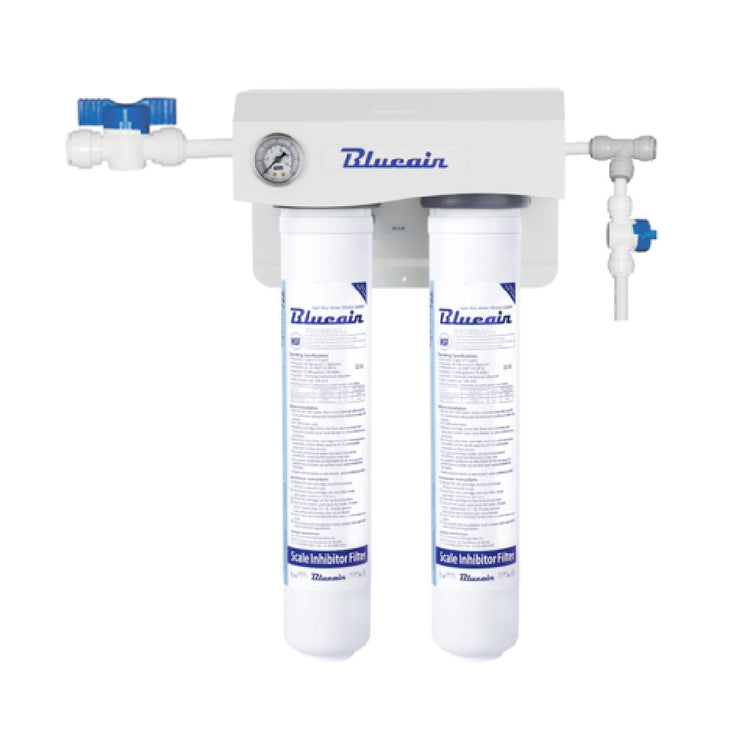 The Blue Air DH-S2 Dual Filtration System For Ice Machines 21000 Gallon Capacity is engineered to deliver superior water quality for ice production, catering to ice machines with a capacity of 650-1400 lbs. This advanced filtration system boasts a 21,000-gallon capacity, ensuring long-lasting performance. Its impressive flow rate of 2 GPM, coupled with an operating pressure range of 30-100 PSI, provides consistent and efficient filtration. The system effectively reduces scale, chlorine taste, and odor, thanks to its 0.5-micron rating. Operating within a temperature range of 35-100°F, it adapts to various environmental conditions. The filtration system features a 3/8" inlet and outlet size, which includes a water pressure gauge for easy monitoring and maintenance. Certified by NSF, this filtration system is a reliable choice for ensuring high-quality ice production in commercial settings. Its technical specifications are designed to meet the demands of different market segments, providing a unique value proposition for industries that prioritize hygiene and performance in ice making.