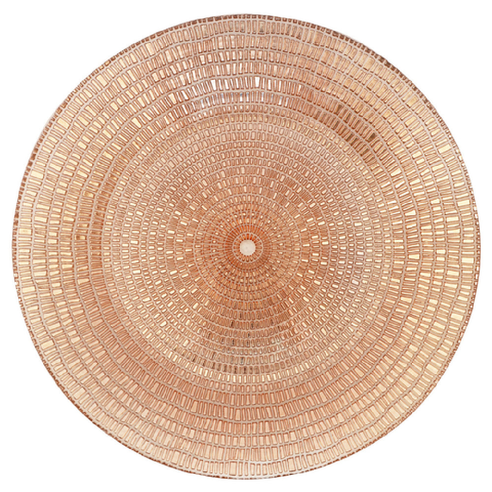 The Bon Chef 200003RG Charger Plate 13" Dia Glass is a decorative dining accessory designed to enhance table presentations with its striking sparkle design and elegant rose gold finish. Measuring 13 inches in diameter, this charger plate is crafted from high-quality glass, providing a sturdy and sophisticated backdrop for service ware in upscale dining settings. Its rose gold hue adds a luxurious touch to any table setting, making it suitable for weddings, banquets, and fine dining restaurants aiming to create a memorable dining experience. The plate's sparkle design captures and reflects light, adding a visual appeal that complements various themes and décors. For maintenance, it is recommended that this charger plate be hand washed to preserve its aesthetic and integrity. The product is conveniently packed with 8 charger plates per case, making it a practical choice for larger events or establishments requiring bulk quantities. This product serves as both a functional and decorative piece, offering versatility in its application across different market segments within the hospitality industry. As a statement piece, the Bon Chef 200003RG Charger Plate enhances the dining ambiance while maintaining practicality and durability, embodying both elegance and efficiency in its design.