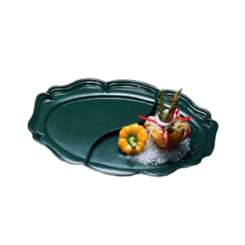 The Bon Chef 2028DDKBLU Queen Anne Divided Platter is a meticulously designed serving solution, measuring 14-3/4 inches by 20 inches. Crafted from durable aluminum, this platter features a unique ceramic-look coating that mimics the sophisticated aesthetic of ceramic while maintaining the practical advantages of aluminum, such as lightweight handling and enhanced durability. The platter is finished in Sandstone with a striking Dark Blue hue, offering a visually appealing presentation that is both modern and classic. The divided design of the platter allows for versatile serving options, making it ideal for both commercial and home use, catering to segments ranging from high-end restaurants and catering services to elegant home gatherings. Certified by NSF, it adheres to strict standards for public health protection, ensuring safety and quality in professional food service environments. The Bon Chef Queen Anne Divided Platter combines functionality with style, providing a reliable and attractive serving option that will complement a wide range of dining settings.