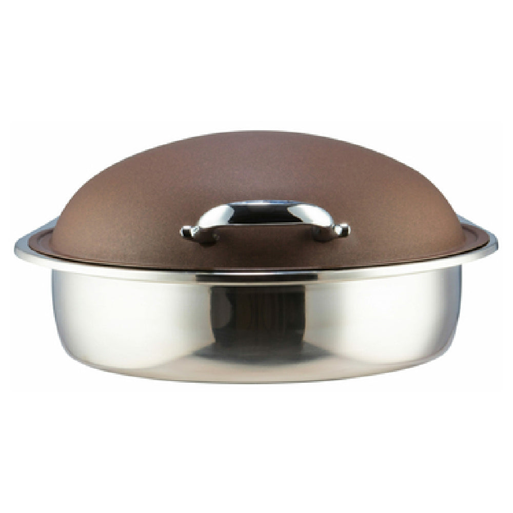The Bon Chef 20314COLOR Power Line Induction Chafer 17"L x 18-1/2"W x 7"H - Round is a versatile and sophisticated chafing solution tailored for the demanding needs of the catering and hospitality industry. This round induction chafer is meticulously crafted from stainless steel, ensuring durability and resistance to corrosion, which is essential for rigorous daily use. Measuring 17 inches in length, 18-1/2 inches in width, and 7 inches in height, it boasts a 2-gallon capacity, providing ample space to keep a variety of dishes warm and ready for serving. A standout feature of this product is the customizable color option, allowing establishments to match their chafers with their brand aesthetics or event themes. Please note that the stand is sold separately, offering flexibility to pair with different stand designs based on venue requirements. This product is particularly beneficial for high-end restaurants, hotels, and catering services that prioritize both performance and style. The induction technology ensures efficient energy use and precise temperature control, making it an excellent choice for maintaining food quality. The Bon Chef 20314COLOR Power Line Induction Chafer is an ideal investment for those seeking a reliable and visually appealing serving solution.