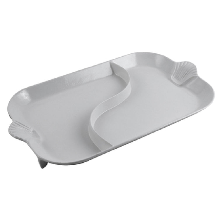 The Bon Chef 2096D Divided Platter 18" X 26" With Shell Handles is a meticulously crafted serving essential, designed to meet the needs of various segments within the food service industry. Measuring 18 inches by 26 inches, this divided platter offers ample space for an elegant presentation of culinary delights. It features distinct shell handles that not only add aesthetic value but also ensure easy handling and transport. Constructed from high-quality aluminum, the platter is finished with a Pewter-Glo coating, lending it a sophisticated sheen while also enhancing its durability. The platter's design is optimized for both functionality and style, making it suitable for upscale dining environments as well as casual settings. Certified by NSF, this product adheres to stringent public health and safety standards, ensuring it meets the rigorous requirements of professional kitchens. Its divided sections allow for organized plating of multiple items, making it ideal for buffets, catering events, and banquet settings where presentation significantly enhances the dining experience. The Bon Chef 2096D Divided Platter's blend of practicality and elegance makes it a versatile and reliable choice for chefs and catering professionals seeking to elevate their food presentation.