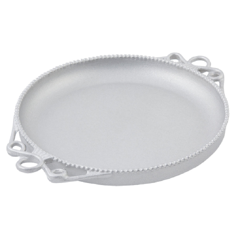 The Bon Chef 2108 Bolero Platter 18" dia. x 2" round is a high-quality serving solution designed to meet the needs of various segments within the food service industry. With a diameter of 18 inches and a height of 2 inches, this round platter provides ample space for presenting a variety of dishes, from appetizers to main courses. Crafted from durable aluminum, it is finished with a Pewter-Glo coating, giving it an elegant, polished appearance that enhances the presentation of any meal. This platter is NSF certified, indicating its compliance with high standards for public health and safety, making it an ideal choice for professional settings such as restaurants, hotels, and catering services. The Bon Chef 2108 Bolero Platter's combination of robust construction and aesthetic appeal makes it a valuable asset for businesses looking to deliver exceptional dining experiences. Its practical design not only supports functional utility but also adds a touch of sophistication to the table setting, appealing to both the culinary industry and discerning clientele seeking quality presentation ware.