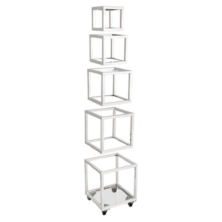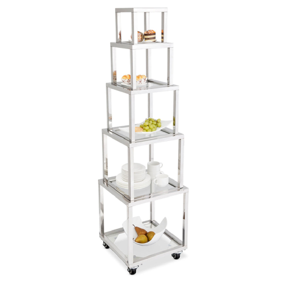 The Bon Chef 2972 Cube Buffet Tower 5-piece Set is an innovative display solution designed to enhance any professional catering or buffet setting with its versatile and stylish construction. Featuring a sleek stainless steel frame, this tower measures 17 inches in width, 17 inches in depth, and reaches an overall height of 66 inches, providing ample space for showcasing a variety of culinary creations. The set includes five removable glass shelves, offering flexibility in presentation and easy access for replenishment or cleaning. The largest cube in the set is equipped with 2-1/2 inch diameter locking casters, ensuring both mobility and stability when arranging the display as needed. This feature is particularly beneficial for dynamic environments where quick and efficient reconfiguration is required. With its clean lines and functional design, the Bon Chef Cube Buffet Tower caters to a diverse range of segment markets within the hospitality industry, from high-end restaurants to banquet facilities, allowing for an elegant and organized presentation that maximizes visual impact and operational efficiency.
