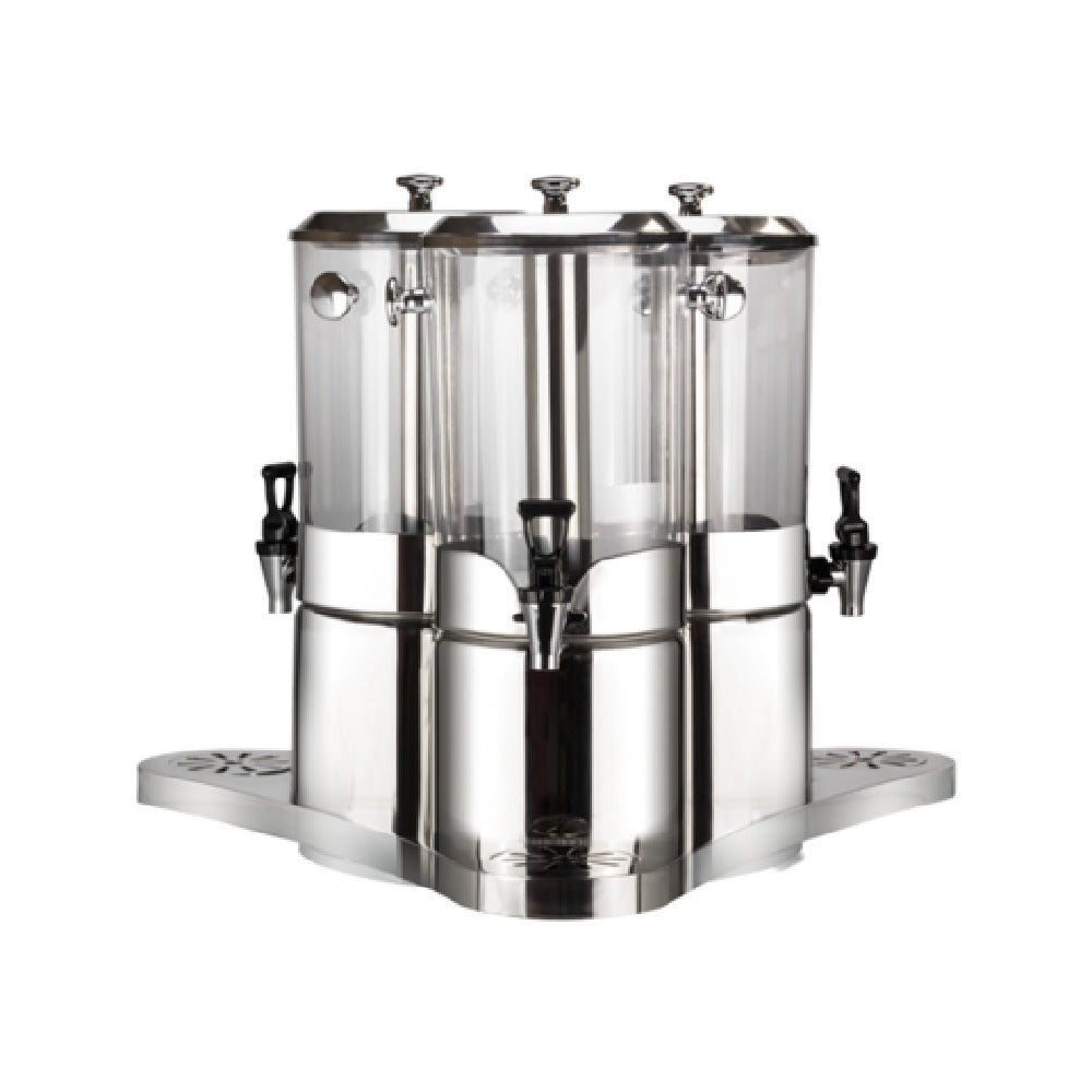 The Bon Chef 40507 Juice Dispenser Triple is a meticulously designed beverage solution featuring three cylinders, each with a capacity of 2 gallons, catering to the needs of food service establishments seeking efficient and versatile drink dispensing. With dimensions measuring 26-1/2 inches by 26-1/2 inches by 22 inches in height overall, this round, rotating juice dispenser is engineered to optimize space while providing an appealing presentation. The inclusion of a stainless steel ice chamber ensures that beverages remain chilled, enhancing the experience of end-users by maintaining drink quality over extended periods. The stainless steel base not only reinforces the unit's structural integrity but also adds a sleek, professional aesthetic suitable for a variety of settings, from hotel buffets to catered events. This product is designed to offer a reliable and durable solution, accommodating the diverse requirements of different market segments within the industry, including restaurants, cafes, and banquet facilities. Its robust construction and functional design make the Bon Chef 40507 Juice Dispenser Triple an indispensable asset for businesses aiming to deliver high-quality beverage service efficiently and effectively.