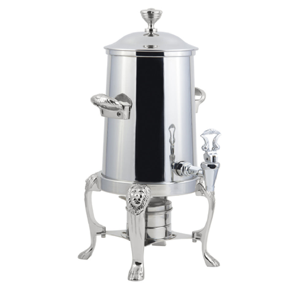 The Bon Chef 48103C Coffee Urn/Server 3-1/2 Gallon Non-insulated is a high-capacity beverage container tailored for large-scale events and hospitality settings. Its stainless steel exterior construction, complemented by chrome trim, offers a sleek and professional appearance suitable for any formal occasion. With a substantial volume of 3-1/2 gallons, this coffee urn/server is designed to efficiently cater to the needs of large gatherings, ensuring ample supply. The unit requires the coffee to be brewed at a temperature of 200°F or higher to sustain its warmth for up to 3 hours, making it perfect for prolonged events where maintaining drink temperature is crucial. Additionally, the solid fuel heating mechanism is a reliable choice for venues without direct electrical access, providing flexibility in various service environments. The "Lion" designation indicates a model or design series, potentially signifying a distinct aesthetic or functional feature unique to Bon Chef's lineup. This coffee urn/server is an ideal solution for catering companies, banquet halls, and event planners, offering a combination of substantial capacity and elegant design to meet the demands of diverse market segments in the food and beverage industry.