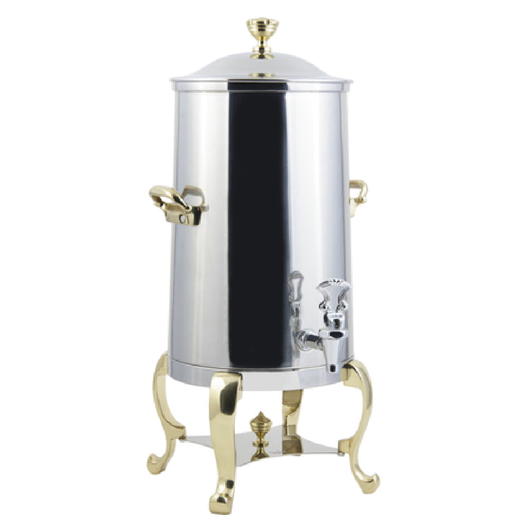 The Bon Chef 49005 Coffee Urn/Server is a meticulously designed beverage dispenser ideal for a range of professional settings. This urn features a substantial capacity of 5 gallons, making it well-suited for high-demand environments like catering events, hotels, and large gatherings. Its dimensions—12 inches in diameter and 29 inches in height—ensure that it can hold a significant volume of coffee while remaining space-efficient. The urn is constructed with a durable stainless steel exterior, complemented by elegant brass trim, which not only enhances its aesthetic appeal but also provides robust protection against wear and tear. The unit is insulated to maintain the coffee's temperature, requiring it to be brewed at 200°F or higher to ensure it remains hot for up to three hours. This feature makes it particularly valuable for venues where coffee needs to be served over extended periods. The Bon Chef 49005's Roman design elements add a touch of sophistication, making it a perfect fit for upscale venues seeking both functionality and style. Whether for a bustling cafe or a luxurious banquet hall, this coffee urn/server combines utility with a classic design to meet the diverse needs of the hospitality industry.