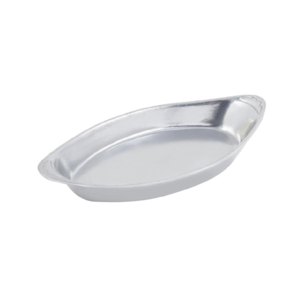 The Bon Chef 5001 Au Gratin Dish is a versatile kitchen essential meticulously crafted for both professional and home chefs. With a capacity of 12 oz., this dish provides ample space for preparing individual portions of delectable gratin dishes. Its dimensions, 4-3/4" x 9-3/4", make it an ideal size for serving at the table, seamlessly fitting into various dining settings. The dish's oval shape not only enhances its aesthetic appeal but also ensures even heat distribution, crucial for achieving perfectly cooked gratin. Constructed from durable aluminum, the Bon Chef 5001 is lightweight yet sturdy, ensuring longevity and ease of handling. The distinctive Pewter-Glo finish adds a touch of elegance and sophistication, making it a striking addition to any culinary presentation. This au gratin dish is particularly valuable in the restaurant and catering industry, where presentation and practicality are paramount. Its design allows for efficient stacking and storage, saving precious kitchen space. The Bon Chef 5001 Au Gratin Dish embodies a blend of functionality and style, catering to the needs of chefs who require reliable, high-quality cookware that enhances both the cooking process and the dining experience.