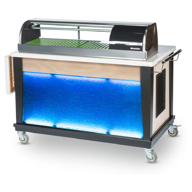 The Bon Chef 50045 Sushi Cart is a versatile unit designed to enhance the presentation and storage of sushi in various settings. With dimensions of 54-1/2 inches in length, 30 inches in width, and 45 inches in height, it features a solid surface countertop complemented by a solid surface drop leaf, offering ample space for preparation and display. Central to its design is the 48-inch curved glass refrigerated sushi display case, ensuring sushi remains fresh and appetizing. The cart's aesthetic appeal is enhanced by a back-lit front textured blue acrylic panel, adding a modern touch to any environment. Mobility is facilitated by 4-inch heavy-duty non-marking casters, with two locking and two non-locking for stability and ease of movement. The cart operates on 120 volts, with a single phase and 13 amps, and is equipped with a NEMA L5-20P plug. This sushi cart serves as an ideal solution for restaurants, catering services, and events that require a mobile and efficient sushi display and storage option, ensuring convenience and style in one package.