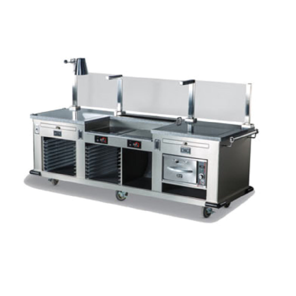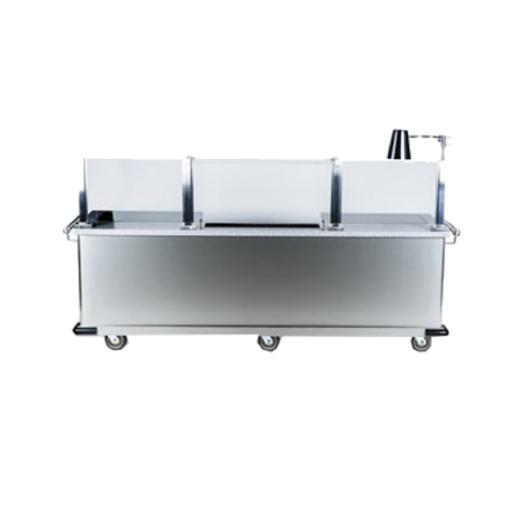 The Bon Chef 50147 Custom Chef's Table is an expertly crafted culinary workstation, measuring 34" x 96" x 60" with a durable stainless steel body. This table is equipped with two 16" x 22" radiant heat surfaces and two 1800 watt induction stoves (model 12083), providing versatile cooking capabilities. A 450 watt warming/holding drawer and a 300 watt adjustable heat lamp ensure that dishes are maintained at optimal temperatures. Additional functionality is offered through two slide-out plating/utility shelves and slots accommodating 16 full-size 18" x 26" sheet pans. The insulated ice well and stainless steel vertical food guard with an over shelf enhance both storage and service efficiency. For electrical requirements, it features two 120v 20 amp outlets and is compatible with 120v/60/1-ph, 30 amps, NEMA L5-30P outlets. This chef's table is designed for professional kitchens where efficiency and adaptability are paramount, making it a versatile asset for catering services, restaurants, and event venues. Its comprehensive features and practical design provide a unique value proposition, catering to diverse segment markets within the food industry that require reliable and high-performance equipment.