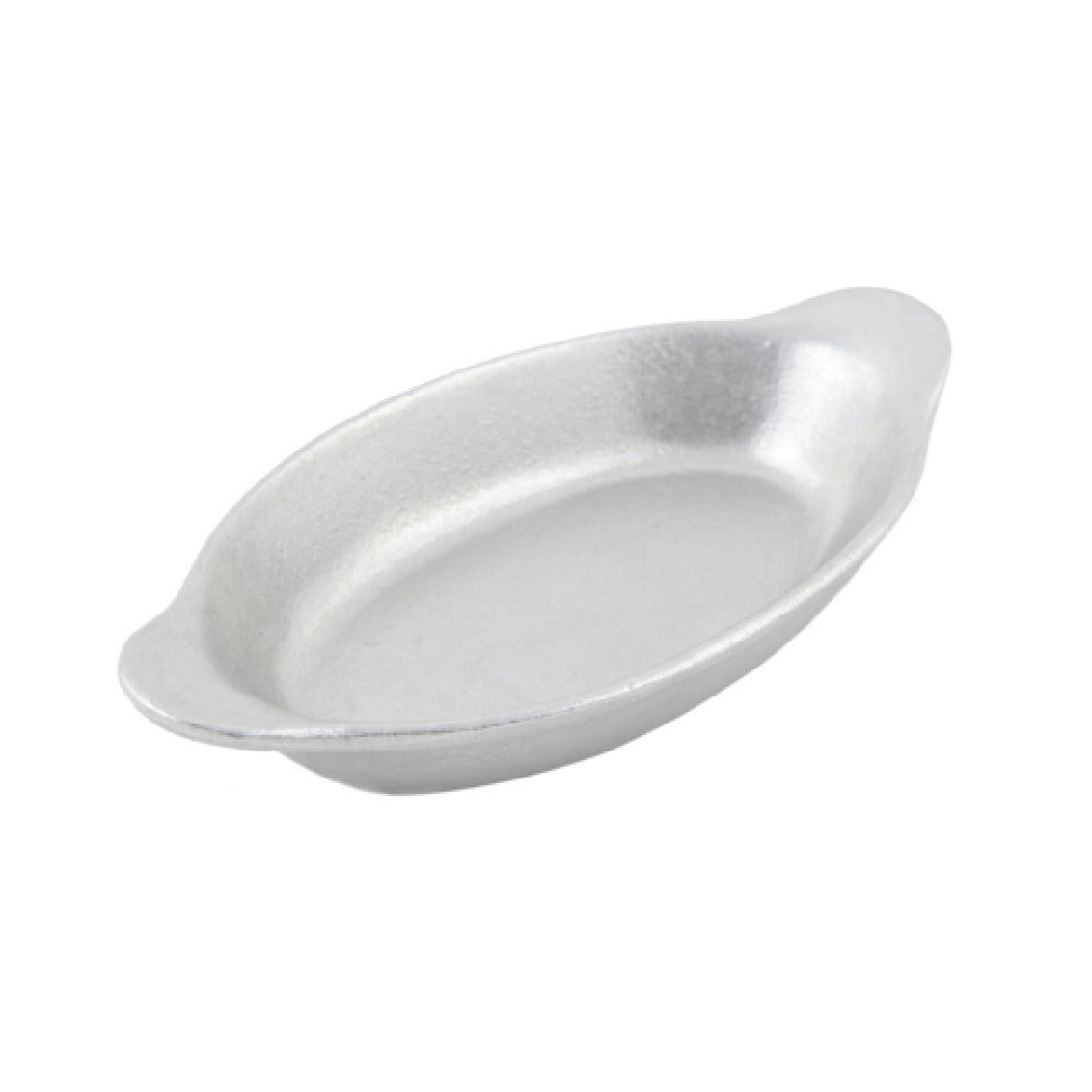 The Bon Chef 5020 Au Gratin Pan is a versatile kitchen essential, expertly crafted with an elegant Pewter-Glo finish. This pan has a capacity of 6 ounces, making it perfect for individual servings of au gratin dishes, appetizers, or side dishes. Measuring 4-3/4 inches by 7-1/2 inches, the oval-shaped design ensures even heat distribution, enhancing the culinary experience. Constructed from high-quality aluminum, this pan offers excellent heat conductivity and durability, essential for professional kitchens and home chefs alike. The Bon Chef 5020 is designed to meet the needs of both commercial and residential markets, providing an ideal solution for restaurants, catering services, and gourmet home cooking. Its unique aesthetic and practical size make it an attractive addition to any table setting, while its robust construction ensures it withstands the rigors of regular use. This pan's distinctive features and reliable performance make it a valuable tool for chefs seeking to deliver exceptional dining experiences.
