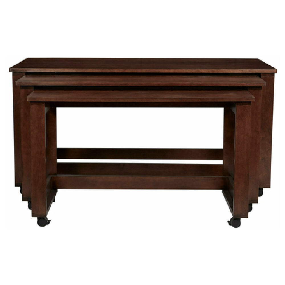 The Bon Chef 50500 Nesting Table Set 3-piece is an elegantly designed solution for establishments looking to optimize space while maintaining a sophisticated aesthetic. This set comprises three rectangular tables, each crafted with a solid wood countertop and legs, finished in a rich walnut hue. The largest table measures 72"L x 30"W x 36"H, followed by the 63"L x 27"W x 32"H table, and the smallest at 53"L x 24"W x 28"H. Each table is equipped with 2" ball casters, allowing for easy movement and reconfiguration within any setting, from upscale dining areas to versatile event spaces. An edge protector ensures durability and longevity, making it a practical choice for high-traffic environments. The Bon Chef 50500 set is ideal for catering businesses, restaurants, or hotels seeking to add functional yet stylish furniture to their operations, providing a seamless blend of mobility and elegance. The thoughtful construction of this set supports diverse applications, ensuring that it meets various functional needs while enhancing the visual appeal of the space it occupies.