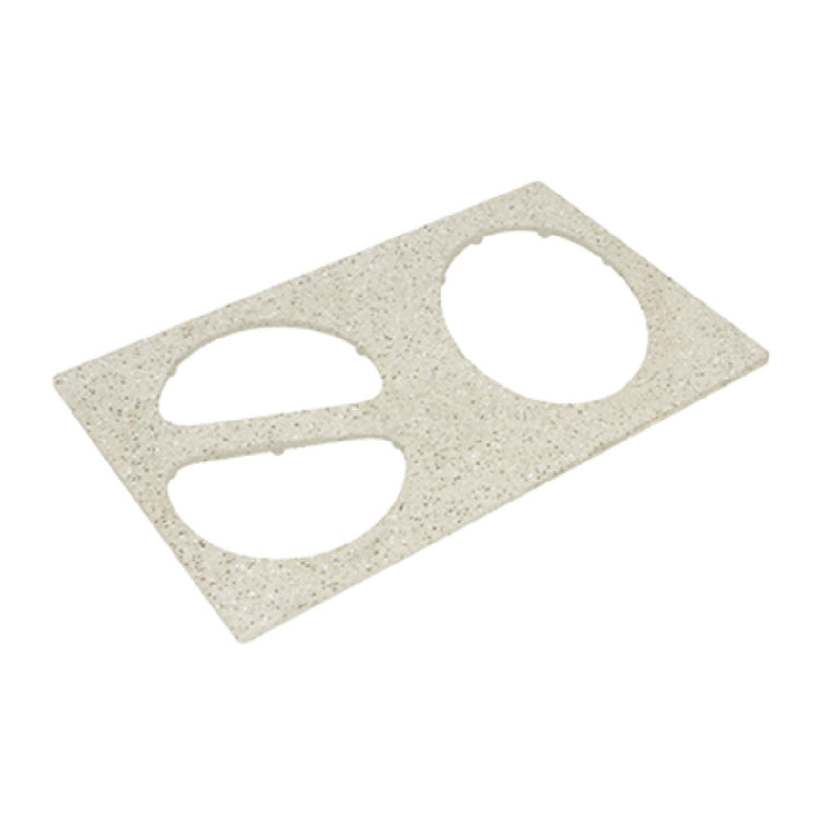 The Bon Chef 52060 E-Z Fit Bonstone Tile measures 12-3/4 inches by 20-13/16 inches, and is designed as a single size unit, making it a versatile component for commercial kitchen environments. This specialized tile features three precisely engineered cutouts, accommodating one #5203 and two #5202 units, which provides seamless integration with corresponding equipment. It is important to note that the Bonstone Tile is not intended for steamtable use, ensuring its application is suited for appropriate kitchen configurations. The design of this tile focuses on enhancing operational efficiency in professional food service settings, offering an adaptable solution for chefs and kitchen managers looking to optimize their workspace. The Bon Chef 52060 E-Z Fit Bonstone Tile's unique cutout configuration caters to diverse culinary applications, supporting the effective organization of kitchen equipment. Its material composition and size specifications are tailored to meet the demands of dynamic kitchen environments, providing a sturdy and reliable surface for various culinary tasks. The technical attributes of the Bonstone Tile, including its precise dimensions and compatibility with specific equipment models, underline its utility as a strategic component within food service operations, contributing to streamlined kitchen workflows and enhanced productivity.