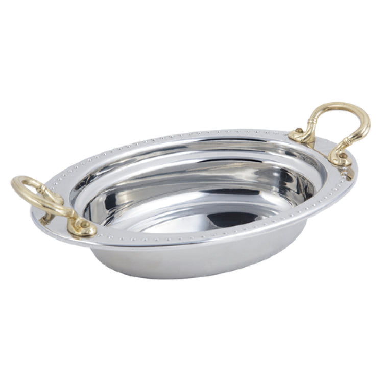 The Bon Chef 5304HR Food Pan Full Oval 2 Qt. (64 Oz.) Capacity is a versatile and elegantly designed kitchen essential, perfect for various food service settings. With dimensions of 13-1/8" x 8-7/8" x 2-1/2", this food pan provides ample space for serving and displaying a range of dishes. Its full oval shape is not only aesthetically pleasing but also enhances the presentation of food, making it ideal for catering events, buffets, and upscale dining establishments. The inclusion of round handles in the Bolero design adds convenience and style, allowing for easy handling and transportation. Crafted from high-quality stainless steel, the Bon Chef 5304HR ensures durability and a sleek, professional appearance. This food pan is NSF certified, guaranteeing it meets strict public health protection standards, and UL listed for safety assurance. The 2-quart (64 oz.) capacity makes it suitable for serving moderate portions, catering to different market segments within the food industry, from high-volume commercial kitchens to smaller boutique eateries. Its robust construction and attractive design make the Bon Chef 5304HR Food Pan a valuable addition to any culinary environment, offering functionality and elegance in one comprehensive package.