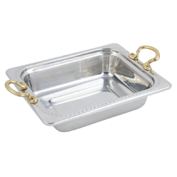 The Bon Chef 5309HR Food Pan 1/2 Size 3 Qt. (96 Oz.) Capacity is an essential piece of kitchenware tailored for versatile culinary environments. This high-quality rectangular pan features a capacity of 3 quarts (96 ounces), ideal for accommodating a variety of food items, making it a reliable choice for both small and large-scale food service operations. Measuring 10-1/2 inches by 13 inches with a depth of 2-3/4 inches, it provides ample space to hold and serve food efficiently. Constructed from durable stainless steel, known for its corrosion resistance and ease of cleaning, this food pan is designed for longevity and consistent performance under rigorous conditions. The inclusion of round handles enhances its ergonomic design, allowing for easy handling and transportation, a feature that is particularly beneficial in fast-paced kitchen settings. The Bolero design adds an element of elegance, seamlessly blending with various kitchen aesthetics. Certified by NSF and UL, this food pan meets stringent public health and safety standards, ensuring that it upholds quality assurance expectations across different food service sectors. Whether employed in restaurants, catering businesses, or institutional dining, the Bon Chef 5309HR Food Pan embodies functionality, durability, and design excellence, making it a pivotal asset in any professional kitchen.