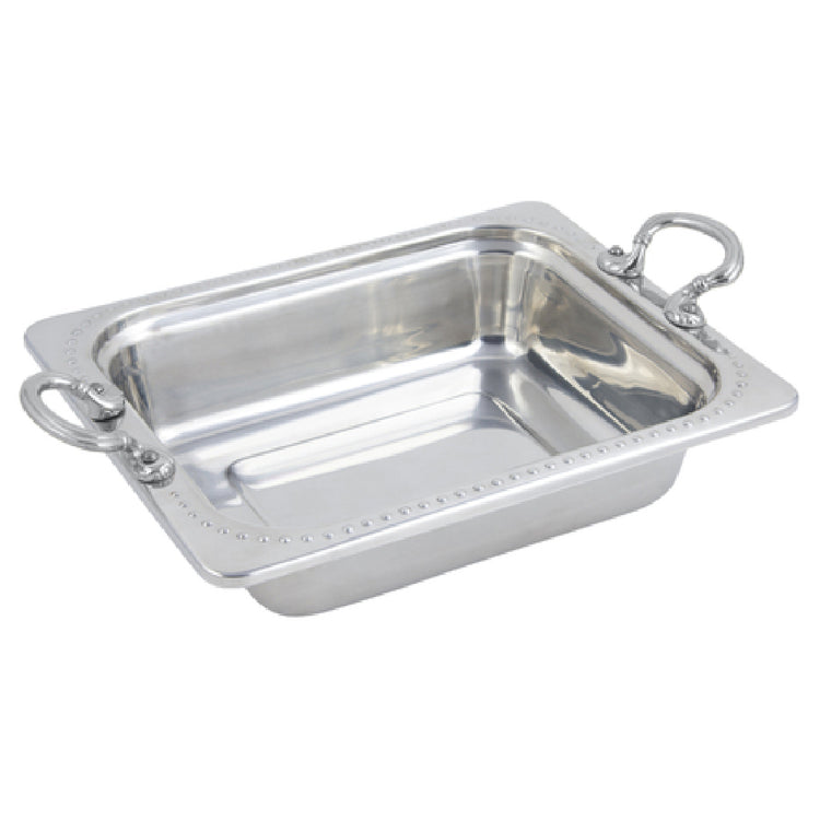 The Bon Chef 5309HRSS Food Pan 1/2 Size 3 Qt. (96 Oz.) Capacity is an expertly designed culinary tool tailored to meet the diverse needs of the food service industry. This rectangular food pan measures 10-1/2" x 13" x 2-3/4", providing ample space for a variety of culinary applications, from cooking to display. Its 3-quart (96-ounce) capacity allows it to accommodate a generous amount of food, making it an excellent choice for both professional kitchens and catering services. The pan is crafted from high-quality stainless steel, ensuring durability and a sleek, modern aesthetic. Unique to its design is the incorporation of round stainless steel handles, which not only add to its stylish appearance but also facilitate easy transportation and handling. The Bolero design adds a touch of elegance, enhancing presentation in any dining setting. Certified by NSF and UL, this food pan meets rigorous standards for safety and sanitation, ensuring compliance in commercial environments. The Bon Chef 5309HRSS Food Pan is a versatile choice that combines practical functionality with refined design, effectively supporting the operational needs of restaurants, hotels, and catering events, while seamlessly integrating into a professional culinary environment.