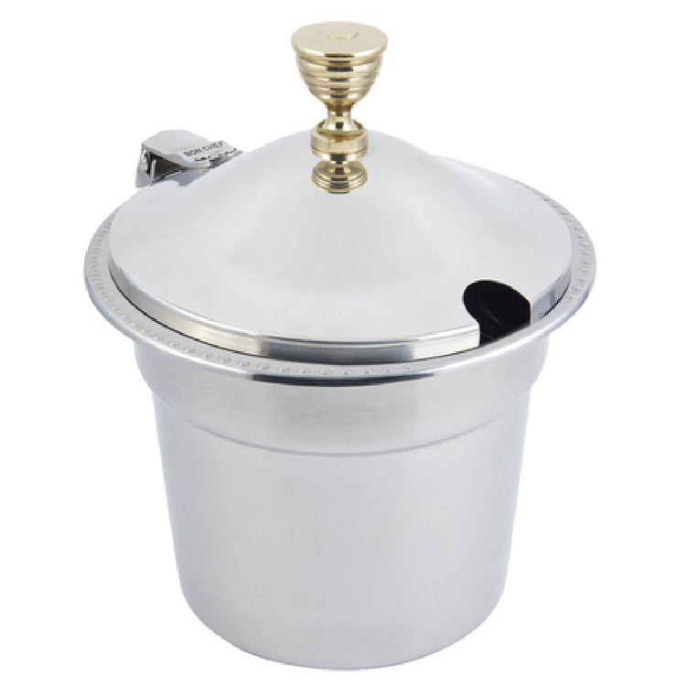 The Bon Chef 5311WHC Soup Tureen is a high-capacity serving essential, boasting a volume of 7 qt. 1 pt., making it suitable for large-scale culinary settings. Measuring 10-5/8 inches in length and 8-1/4 inches in height, this soup tureen is designed to accommodate substantial servings of soups or stews. Its incorporation of a hinged cover ensures ease of access and retains heat, enhancing the dining experience with consistent temperature maintenance. The Bolero design adds a touch of elegance, seamlessly blending with various culinary presentation styles. Crafted from stainless steel, this soup tureen guarantees durability and resistance to corrosion, making it a reliable choice for both high-end restaurants and catering services. The inclusion of NSF certification underscores its compliance with stringent health and safety standards, providing assurance of its quality and safety in food service operations. The Bon Chef 5311WHC Soup Tureen is an exemplary choice for professionals seeking a combination of functionality and style in their dining presentations, well-suited for diverse market segments ranging from upscale dining establishments to large event catering. Its robust construction and thoughtful design offer a unique value proposition for those in the food service industry.