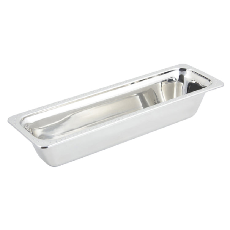 The Bon Chef 5312 Food Pan 1/2 Size Long 4 Qt. (128 Oz.) Capacity is a versatile kitchen essential designed to meet the needs of professional food service environments. With dimensions of 20-31/32" x 6-1/2" x 4" deep, this food pan offers a generous 4-quart (128 oz.) capacity, making it suitable for a variety of culinary applications. The pan's Bolero design adds a touch of sophistication, while its construction from high-quality stainless steel ensures durability and resistance to corrosion, making it ideal for frequent use in commercial settings. Certified by both NSF and UL, the Bon Chef 5312 Food Pan meets stringent public health and safety standards, providing peace of mind in demanding kitchen environments. Its half-size long configuration allows for efficient space utilization and compatibility with standard kitchen setups, making it a practical choice for restaurants, catering services, and institutional kitchens. The Bon Chef 5312 Food Pan's exceptional design and build quality make it a valuable asset for chefs and food service professionals seeking reliable performance and lasting value.