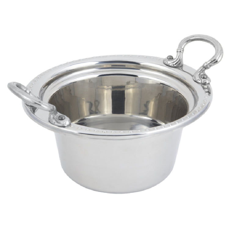 The Bon Chef 5350HRSS Casserole/Steamtable Dish is a versatile dish with a 2 qt. (64 oz.) capacity, designed to meet the needs of diverse culinary environments, including catering, restaurant, and buffet settings. Measuring 10" x 9" x 4-3/4", it provides ample space for preparing and presenting a variety of dishes, from casseroles to side dishes, all while maintaining a sleek profile. The dish features round stainless steel handles, ensuring durability and ease of handling, even when filled to capacity. Its stainless steel construction not only enhances its longevity but also contributes to a professional appearance suitable for any formal dining setting. The Bolero on the rim adds an aesthetic touch that distinguishes it from standard serving dishes, enhancing its appeal for upscale service presentations. This dish is NSF certified and UL listed, verifying its compliance with strict safety and sanitation standards, making it a reliable choice for professional food service operations that prioritize quality and safety. The Bon Chef 5350HRSS Casserole/Steamtable Dish is engineered to provide exceptional functionality and durability, making it an indispensable tool for chefs and food service professionals who demand both performance and style in their kitchenware.