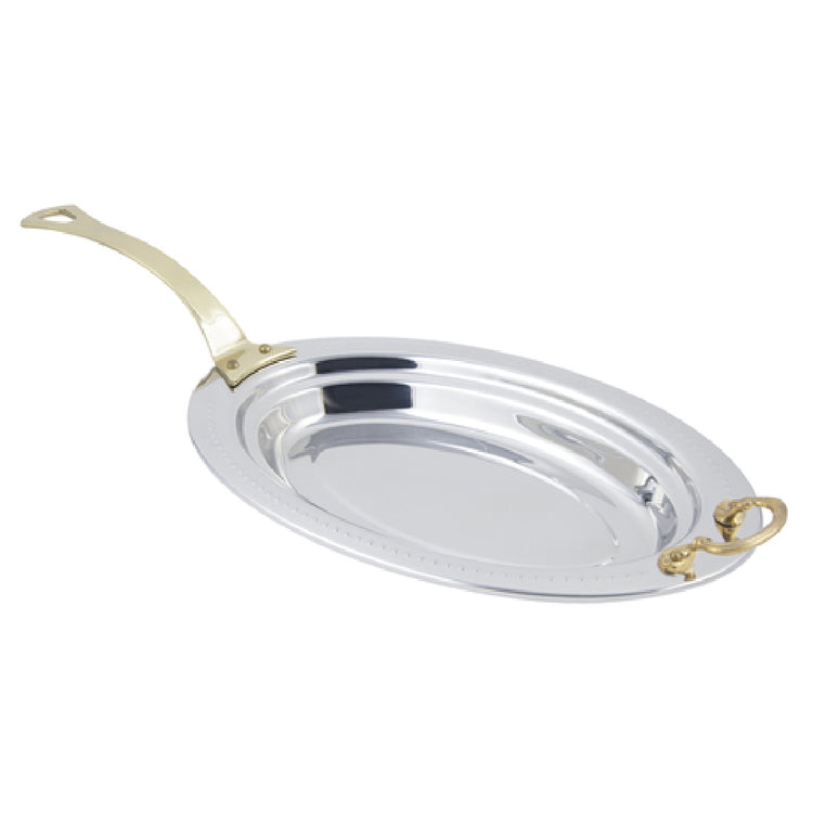 The Bon Chef 5388HL Food Pan Full Oval 2-1/2 Qt. (80 Oz.) Capacity is a versatile solution for culinary professionals seeking efficiency and style in food presentation and storage. With a generous capacity of 2-1/2 quarts (80 ounces), this food pan is designed to meet the diverse needs of the food service industry. Measuring 19 inches in length, 11-13/16 inches in width, and 2 inches in height, it offers ample space while maintaining a sleek profile. The inclusion of a long handle facilitates ease of transport and handling, making it ideal for buffets, catering events, and professional kitchens. Crafted from durable stainless steel, this pan is not only robust but also easy to clean, ensuring a high standard of hygiene. The Bolero design adds an element of sophistication, enhancing the visual appeal of food displays. Certified by NSF and UL, this food pan adheres to rigorous public health and safety standards, affirming its quality and reliability. Whether used in upscale restaurants or casual dining settings, the Bon Chef 5388HL Food Pan is a valuable asset, offering both functionality and elegance for diverse culinary applications.