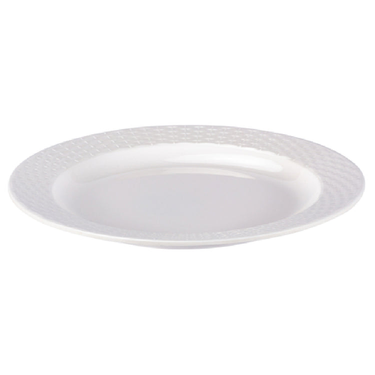 The Bon Chef 53901WHITE Dinner Plate 10-3/4" Dia. Round is a meticulously crafted dining essential, ideal for a variety of culinary settings including restaurants, hotels, and catered events. This dinner plate, measuring 10-3/4 inches in diameter, is designed to seamlessly blend form and function. Made from durable melamine, it offers the appealing aesthetics of china with the resilience needed for high-volume use, making it particularly suitable for environments that demand both style and practicality. The high gloss white finish enhances its visual appeal, providing a pristine backdrop that highlights any dish, while the woven pattern border adds a touch of sophistication. The round shape is traditional yet timeless, accommodating a range of presentation styles from casual dining to formal settings. This plate is not only an elegant choice but also a practical one, capable of withstanding the rigors of frequent use without compromising its quality or appearance. The Bon Chef 53901WHITE Dinner Plate, with its blend of durability and design, is the perfect choice for those seeking to elevate their dining experience with a product that embodies both elegance and endurance.