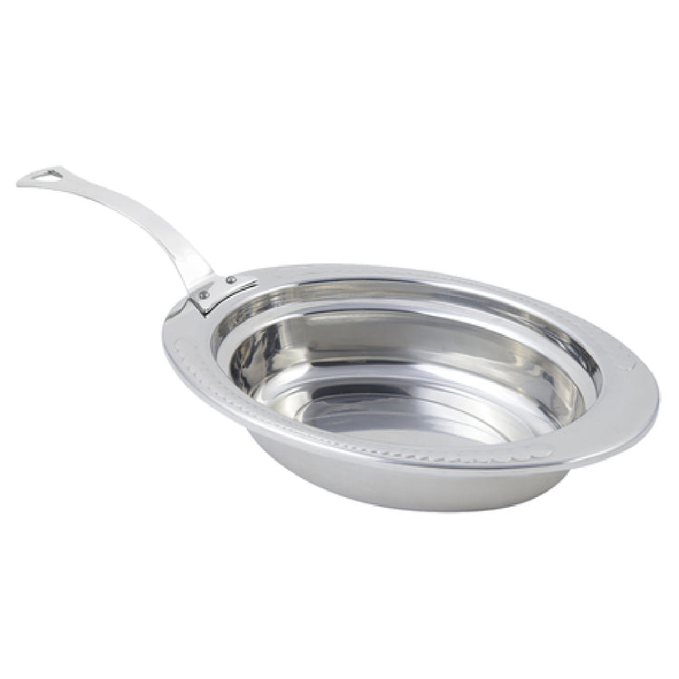 The Bon Chef 5404HLSS Food Pan Full Oval 2 Qt. (64 Oz.) Capacity is a meticulously designed kitchen essential that caters to diverse culinary environments with precision and elegance. This full oval food pan, measuring 13-1/8 inches by 8-7/8 inches by 2-1/2 inches, is crafted to accommodate a capacity of 2 quarts or 64 ounces, making it suitable for a range of serving applications in both commercial and residential settings. The inclusion of a long stainless steel handle enhances its functionality, allowing for effortless handling and transport. The pan showcases the exquisite Laurel design, adding a touch of sophistication to its robust construction. Made entirely of stainless steel, it promises durability and longevity, ensuring it withstands the demands of busy kitchen environments. Furthermore, the product's NSF and UL certifications underscore its compliance with health and safety standards, reassuring users of its quality and reliability. The Bon Chef 5404HLSS Food Pan is an ideal choice for professionals seeking a reliable and aesthetically pleasing solution for their culinary needs, offering a blend of utility and elegance that is perfectly suited for the food service industry.