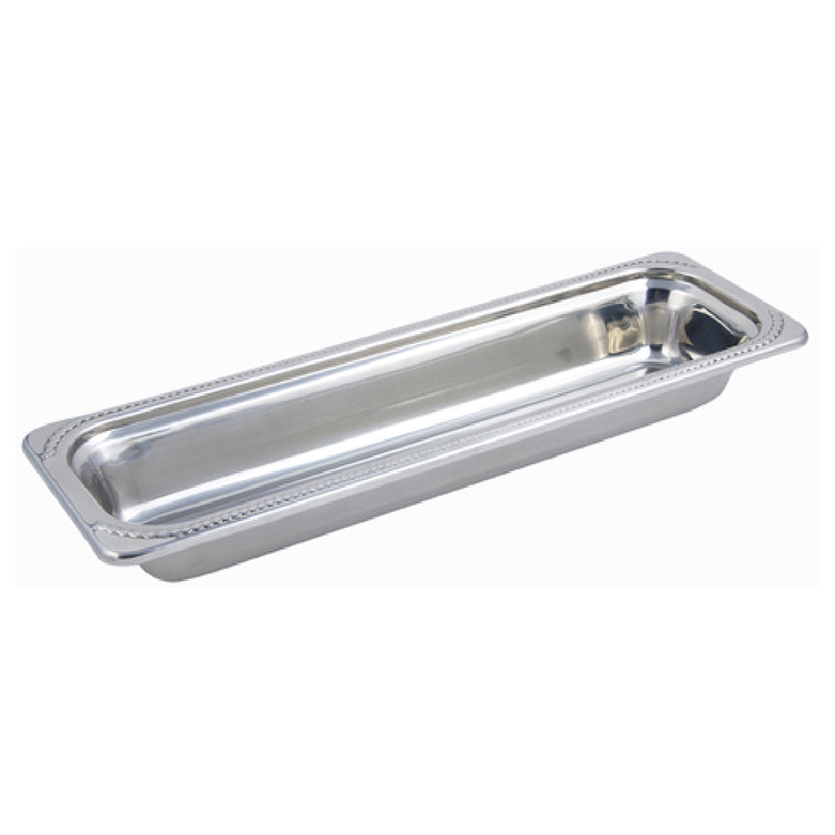The Bon Chef 5410 Food Pan 1/2 Size Long 3 Qt. (96 Oz.) Capacity exemplifies top-tier craftsmanship, designed specifically to meet the diverse needs of the food service industry. With precise dimensions of 20-31/32" x 6-1/2" x 2-3/4" deep, this pan delivers optimal volume for efficient food storage and service. Crafted from high-quality stainless steel, it not only promises durability but also enhances professional presentation with its polished appearance. The pan features the elegant Laurel design, adding a touch of sophistication to any culinary setting. Certified by NSF and UL, the Bon Chef 5410 Food Pan adheres to high standards of safety and sanitation, making it a reliable choice for rigorous kitchen environments. This versatile pan is ideal for a variety of markets, including restaurants, catering services, and institutional dining, where both aesthetic appeal and practical utility are paramount. Its thoughtful design ensures easy integration into existing setups, providing both flexibility and efficiency for any food service operation. Whether used for preparation, display, or storage, the Bon Chef 5410 enhances operational efficiency while maintaining a standard of excellence.