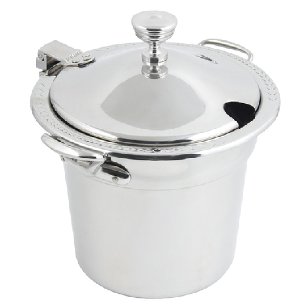 The Bon Chef 5411WHCHRSS Soup Tureen is a versatile and elegantly designed culinary asset, boasting a capacity of 7 quarts and 1 pint, ideal for both small and large-scale food service operations. Measuring 10-5/8 inches in diameter and standing 8-1/4 inches high, this soup tureen is crafted from high-quality stainless steel, ensuring durability and a sleek, professional appearance. It features a hinged cover that facilitates easy access while maintaining the temperature and quality of the soup within. The tureen is adorned with a Laurel design, adding a touch of sophistication to any dining setting. Equipped with round stainless steel handles, it provides both aesthetic appeal and practical functionality, allowing for easy transport and serving. Additionally, the Bon Chef 5411WHCHRSS is NSF certified, attesting to its compliance with rigorous standards for safety, quality, and performance in commercial food service environments. This makes it an excellent choice for restaurants, catering services, and institutional kitchens seeking a reliable and stylish solution for serving soups and stews. The combination of its ample capacity, robust construction, and elegant design makes this soup tureen a valuable addition to any professional kitchen.