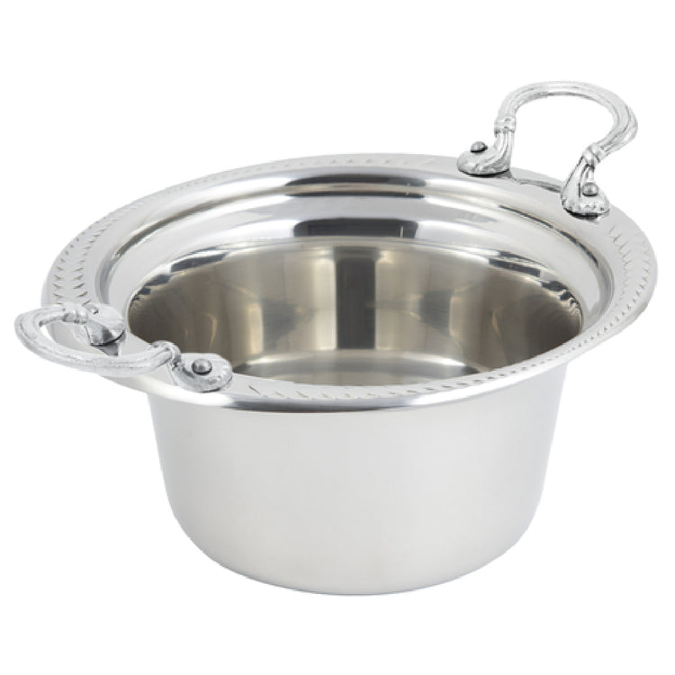 The Bon Chef 5450HRSS Casserole/Steamtable Dish 2 Qt. (64 Oz.) Capacity is a versatile kitchen essential designed to meet the demands of both commercial and home kitchens. With dimensions of 10" x 9" x 4-3/4", this round dish is perfectly suited for a variety of culinary tasks, from baking to serving. Crafted from high-quality stainless steel, it promises durability and a sleek appearance that complements any kitchen decor. Its round stainless steel handles ensure ease of handling and transport, even when the dish is filled to its 2-quart (64 oz.) capacity. The distinctive Laurel design on the rim adds an elegant touch, setting it apart in presentation settings. Compliant with NSF and UL standards, this dish guarantees adherence to safety and quality benchmarks, making it a reliable choice for professional chefs and culinary enthusiasts alike. Its robust construction ensures longevity, while its practical design caters to efficiency in both cooking and serving. Ideal for steam tables and buffets, the Bon Chef 5450HRSS fits seamlessly into the food service industry's varied needs, providing a dependable solution for maintaining food temperature and presentation. This casserole dish is a testament to the perfect blend of functionality and style.