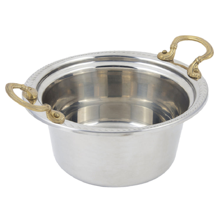 The Bon Chef 5460HR Casserole/Steamtable Dish is a versatile kitchen essential with a capacity of 5 quarts (160 ounces), making it well-suited for both restaurant steam tables and home use. This dish measures an impressive 12-9/16 inches in length, 11-1/2 inches in width, and stands 5-1/2 inches high, offering ample space for a variety of culinary creations. It is meticulously crafted from high-quality stainless steel, ensuring durability and a sleek, professional appearance. The inclusion of round handles facilitates easy handling and transport, enhancing its practicality in dynamic kitchen environments. The dish is accented with a Laurel design on the rim, adding a touch of elegance to its functional design. This product is NSF certified, guaranteeing its adherence to strict public health standards, and UL certification further underscores its compliance with safety requirements. The Bon Chef 5460HR is particularly valuable for catering professionals and food service establishments that seek reliable and stylish cookware options. Its robust construction and thoughtful design make it a standout choice for those who prioritize both aesthetics and performance in their kitchen equipment.