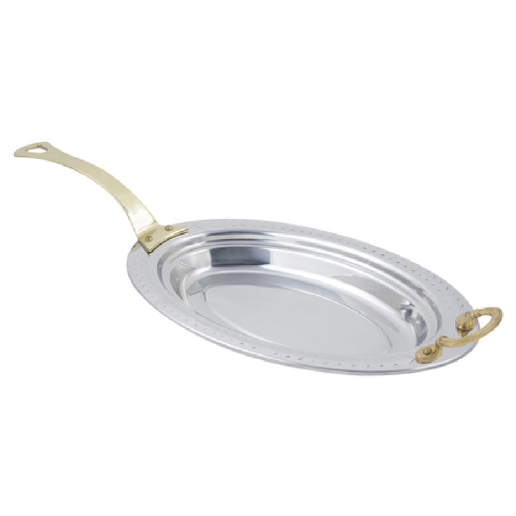 The Bon Chef 5488HL Food Pan Full Oval 2-1/2 Qt. (80 Oz.) Capacity seamlessly marries functionality with aesthetic appeal, making it a standout choice for diverse culinary environments. Crafted in a full oval shape, this food pan boasts a generous 2-1/2 quart (80 oz.) capacity, ideal for both small-scale and extensive food preparations. Measuring 19 inches by 11-13/16 inches by 2 inches, it provides ample room for presenting and storing a variety of dishes. The inclusion of a long handle enhances maneuverability, ensuring ease of use in bustling kitchen settings. Constructed from high-quality stainless steel, the food pan underscores durability while facilitating easy cleaning and maintenance. The Laurel design adds a touch of elegance, making it a perfect fit for upscale dining establishments and catered events. Certified by NSF and UL, it adheres to rigorous public health and safety standards, reinforcing its reliability in professional settings. The Bon Chef 5488HL Food Pan is a practical and stylish solution for chefs and food service professionals seeking a versatile and robust kitchen staple that meets the demands of both functionality and design aesthetics.