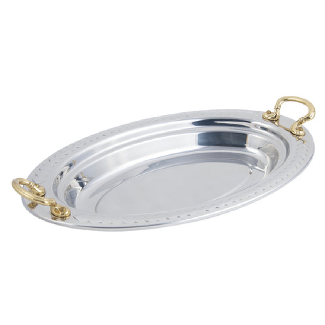 The Bon Chef 5488HR Food Pan Full Oval 2-1/2 Qt. (80 Oz.) Capacity is a meticulously crafted stainless steel food pan, ideal for an array of culinary applications across various market segments. Designed with a generous 2-1/2 quart (80 oz.) capacity, it accommodates substantial quantities, facilitating efficient food preparation and service in both commercial and high-end domestic kitchens. Measuring 19" x 11-13/16" x 2", this full oval pan features ergonomically designed round handles that ensure easy handling and transport, even in the busiest kitchen environments. Its construction from premium stainless steel not only promises enduring durability and resistance to wear but also contributes to its sleek, professional appearance, fitting seamlessly into any kitchen decor. The Laurel design adds a touch of elegance, enhancing the presentation of any dish. This food pan is NSF and UL certified, ensuring compliance with industry standards for safety and sanitation. Whether utilized in a bustling restaurant, a catered event, or a hotel kitchen, the Bon Chef 5488HR Food Pan combines functional capacity with refined aesthetics, making it a valuable investment for professionals seeking reliability and style in their kitchenware.