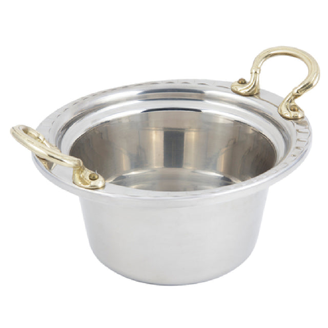 The Bon Chef 5650HR Casserole/Steamtable Dish is a versatile kitchen staple with a 2 qt. (64 oz.) capacity, making it suitable for both residential and commercial use. Measuring 10" x 9" x 4-3/4", this dish is crafted from durable stainless steel, ensuring longevity and resistance to corrosion. It features uniquely designed round handles for easy handling and maneuverability, adding practicality to its robust construction. The rim is adorned with distinct arches, enhancing its aesthetic appeal while maintaining functionality. Certified by NSF and UL, this casserole/steamtable dish meets stringent public health and safety standards, making it a reliable choice for professional kitchens where compliance is crucial. Its size and design make it ideal for use in steam tables, catering to the needs of restaurants, buffet services, and catering businesses by maintaining precise heat distribution and food presentation standards. This dish's elegant yet sturdy design is also perfect for home chefs who value performance and style, offering seamless transition from oven to table. The Bon Chef 5650HR embodies quality craftsmanship, merging practicality with style, and is an essential addition to any food service operation seeking versatile and dependable kitchenware.