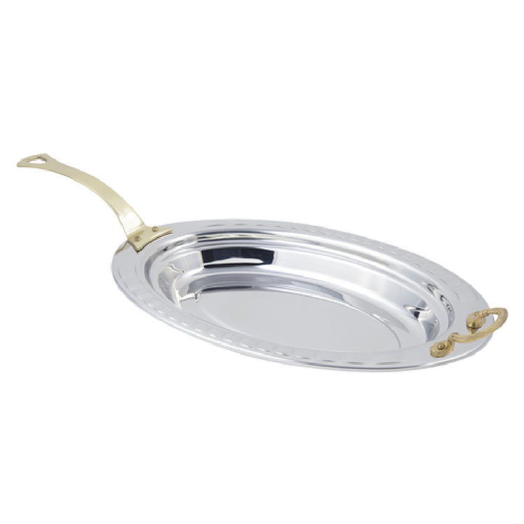 The Bon Chef 5688HL Food Pan Full Oval 2-1/2 Qt. (80 Oz.) Capacity is a versatile and durable kitchen essential designed to meet the demands of professional culinary environments. With its full oval shape, it measures 19 inches in length, 11-13/16 inches in width, and 2 inches in depth, offering a generous capacity of 80 ounces (2-1/2 quarts). This pan is crafted from high-quality stainless steel, ensuring longevity and resistance to corrosion. The pan features a long handle, providing ease of use and safety during transport or serving. Its Arches design adds a touch of elegance, making it suitable for both back-of-house preparation and front-of-house presentation. Certified by NSF and UL, this food pan adheres to strict public health and safety standards, making it a reliable choice for use in restaurants, catering services, and other food service operations. The Bon Chef 5688HL's combination of functional design, ample capacity, and stylish aesthetic makes it an excellent addition to any commercial kitchen, enhancing both efficiency and presentation capabilities.