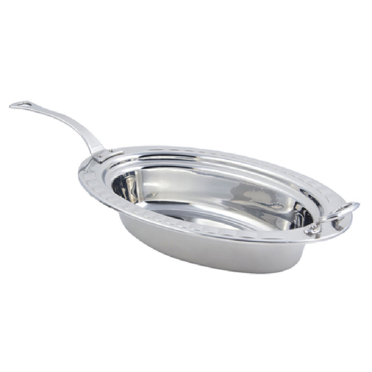The Bon Chef 5699HLSS Food Pan Full Oval 6-1/8 Qt. (196 Oz.) Capacity is a meticulously engineered kitchen essential designed for versatility and functionality. Made from heavy gauge high polished stainless steel, this food pan ensures durability and an aesthetically pleasing finish that complements any professional kitchen environment. Measuring 19 inches by 11-13/16 inches by 3-1/2 inches, it provides ample space with a significant 6-1/8 quart (196-ounce) capacity, ideal for serving large quantities of food efficiently. The long stainless steel handle adds convenience, facilitating ease of transport and handling during service. A unique vapor steam lock shoulder ensures that food retains its temperature and steam, making it suitable for buffet settings and catering services that require maintaining food quality over time. The food pan's Arches design enhances the presentation, blending functionality with style. Certified by NSF and UL, it meets stringent safety and quality standards, making it a reliable choice for food service operations. This food pan is a versatile addition to any commercial kitchen, whether in hotels, restaurants, or catering businesses, offering exceptional utility and longevity in demanding food service settings.