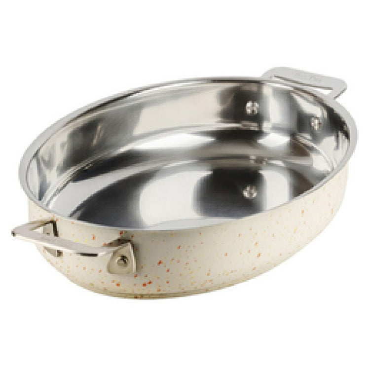The Bon Chef 60002DESERT HotStone Cucina Au Gratin is a versatile kitchen essential, designed for both professional and home chefs who value style and functionality. With a generous capacity of 2-1/2 quarts, this au gratin dish is perfect for a variety of culinary creations. Measuring 12 inches in length, 9-1/8 inches in width, and standing at 2-1/4 inches in height, it offers ample space for cooking and serving. The design includes two 1-1/4 inch square handles, enhancing ease of handling and transportation. Its oval shape is both aesthetically pleasing and practical, allowing for even heat distribution. The induction bottom underscores its compatibility with modern cooking technology, making it suitable for induction cooktops. Constructed from high-quality 18/8 stainless steel, the dish promises durability and longevity. It is oven safe up to 375°F, providing flexibility for various cooking techniques. The Desert finish adds a unique touch to its appearance, making it a stylish addition to any kitchen setting. Ideal for the food service industry, this au gratin dish serves diverse market segments, from restaurants seeking durable cookware to home cooks desiring professional-quality kitchen tools. Its combination of design, functionality, and material quality makes it a standout choice in the culinary world.