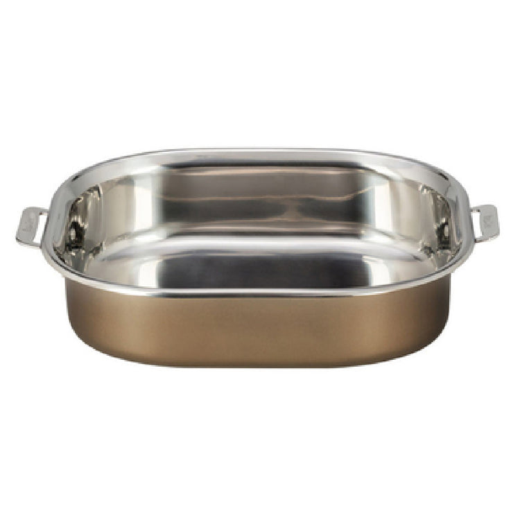 The Bon Chef 60004CLDTAUPE HotStone Cucina French Oven 7 Qt. 15" X 11" X 4-1/8" H is a versatile kitchen essential, offering a blend of functionality and style suitable for a variety of cooking environments. With a generous 7-quart capacity, this rectangular French oven is designed to accommodate substantial culinary creations. Measuring 15 inches in length, 11 inches in width, and 4-1/8 inches in height, it provides ample space for cooking large dishes. The oven is equipped with two 1-1/4 inch square handles, ensuring ease of handling and transport, even when wearing kitchen mitts. Its induction bottom is a key feature, allowing for efficient heat conduction and compatibility with induction cooktops. Crafted from durable 18/8 stainless steel, this oven is built to withstand the rigors of professional kitchens while maintaining a sleek appearance. The taupe finish adds a touch of elegance, ensuring it fits seamlessly into any kitchen decor. Importantly, the oven is safe for use in settings up to 375°F, making it suitable for a wide range of recipes. With its comprehensive features, the Bon Chef HotStone Cucina French Oven is ideal for both home cooks and professional chefs looking for reliable and efficient cookware.