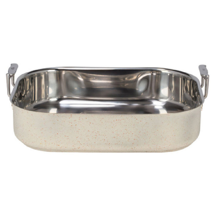 The Bon Chef 60010CLDDESERT HotStone Cucina Rotisserie Pan is a high-capacity 10-quart solution for culinary professionals seeking versatile cookware. Measuring 16-1/2" x 14-1/4" x 4" H, this rectangular rotisserie pan is designed to meet the demands of busy kitchens. Constructed from durable 18/8 stainless steel, it ensures longevity and resistance to wear. It features two 1/2" square handles, providing a secure grip for safe handling and transport, even under high-temperature conditions. Its induction bottom makes it compatible with modern induction cooktops, enhancing its adaptability across various cooking environments. Furthermore, the pan is oven-safe up to 375°F, allowing chefs to explore a wide range of cooking techniques without compromising performance. The Desert color finish adds a touch of elegance and style, making it an attractive addition to any kitchen setting. This combination of features makes the Bon Chef 60010CLDDESERT HotStone Cucina Rotisserie Pan an essential tool for hospitality professionals, catering businesses, and culinary enthusiasts who demand reliability and efficiency in their cookware, regardless of the cooking environment or heat source employed. This pan's unique design and superior materials elevate its utility in both commercial and upscale residential kitchens.