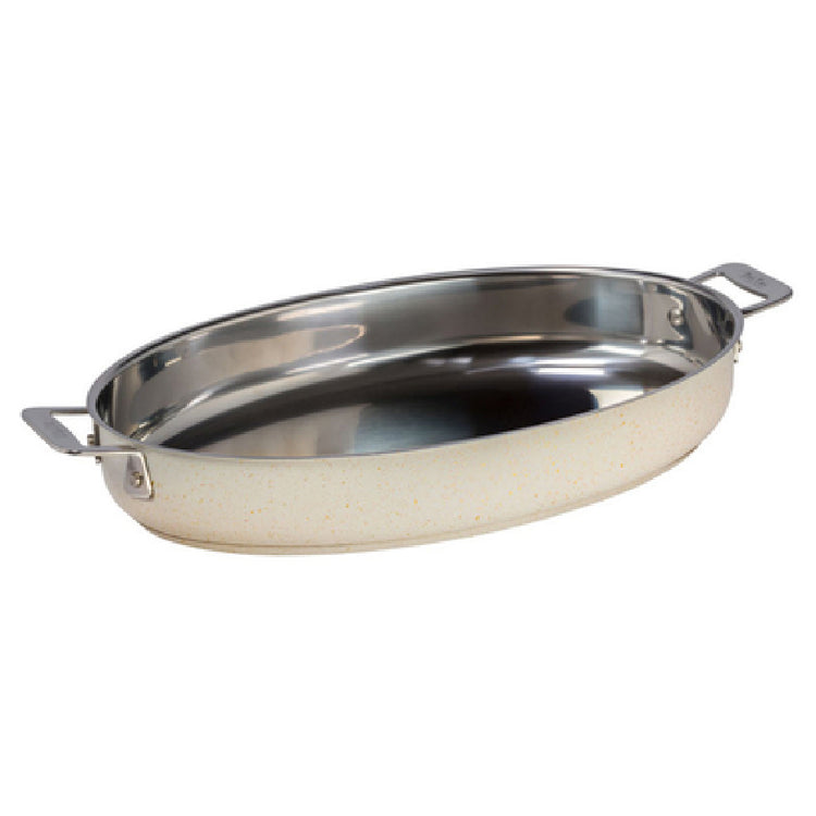 The Bon Chef 60018DESERT HotStone Cucina Au Gratin 4 Qt. 15-3/8" X 10" X 2-5/8" H is an expertly crafted kitchen essential, designed to accommodate a variety of culinary needs with precision and style. This oval-shaped Au Gratin pan, with its generous 4-quart capacity, measures 15-3/8 inches in length, 10 inches in width, and 2-5/8 inches in height, providing ample space for preparing and serving an array of dishes. The inclusion of two 1-1/4 inch square handles ensures convenient handling and transport, enhancing safety and efficiency in the kitchen environment. Constructed from high-quality 18/8 stainless steel, this pan features an induction bottom, making it compatible with induction cooktops for versatile cooking possibilities. It is oven safe up to 375°F, allowing for seamless transitions from stove to oven, ideal for a diverse range of professional culinary applications. The Desert finish adds a sophisticated aesthetic, making this Au Gratin pan a stylish addition to any food service establishment. Its durable construction ensures long-lasting performance, making it a reliable choice for chefs and restaurateurs seeking a balance of form and function in their cookware.