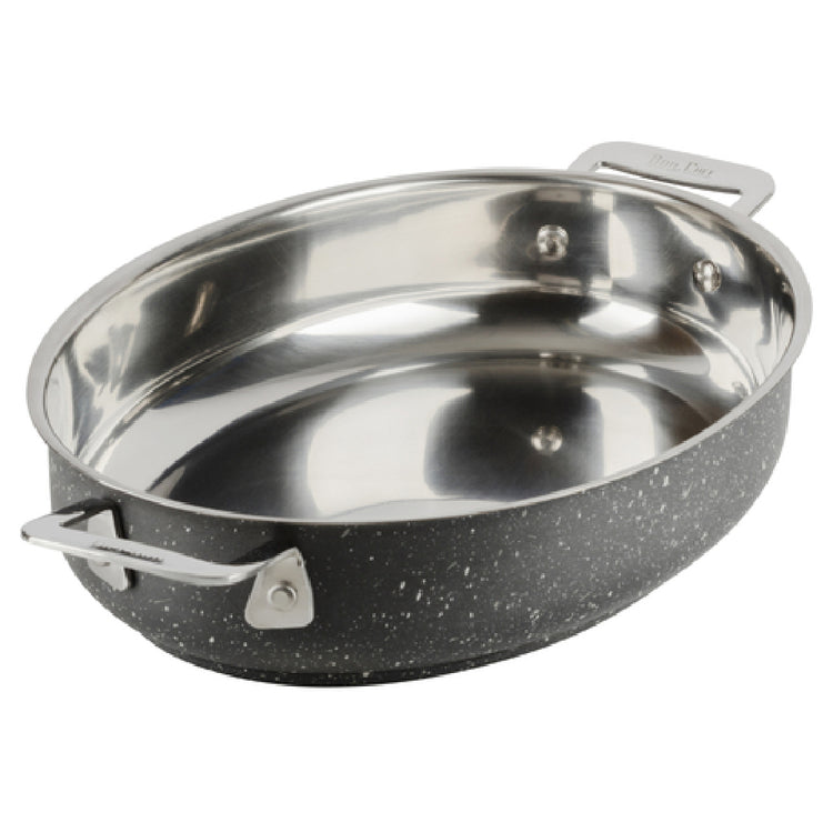 The Bon Chef 60019GALAXY HotStone Cucina Au Gratin is an exceptional culinary tool with a generous 48 oz. capacity, ideal for serving gourmet baked dishes. Measuring 9-5/8" x 7-11/16" x 2-1/4" H, this oval dish combines style and practicality, making it a perfect choice for upscale dining establishments. It features two 1-1/8" square handles, providing a secure grip for easy handling. Designed for versatility, it is oven-safe up to 375°F, allowing chefs to achieve perfectly baked au gratin dishes. The induction bottom ensures compatibility with various cooking surfaces, enhancing its functionality in diverse kitchen settings. Constructed from 18/8 stainless steel, the Bon Chef 60019GALAXY ensures durability and a sleek appearance, fitting seamlessly into any professional kitchen environment. Its robust design and high-quality materials make it a favored choice among chefs who value precision and reliability. The HotStone Cucina Au Gratin is part of the Galaxy line, representing a blend of innovation and tradition in cookware. Its technical specifications make it suitable for a wide range of culinary applications, from high-end restaurants to catering services, offering a unique value proposition for professionals seeking both performance and aesthetics in their cookware.