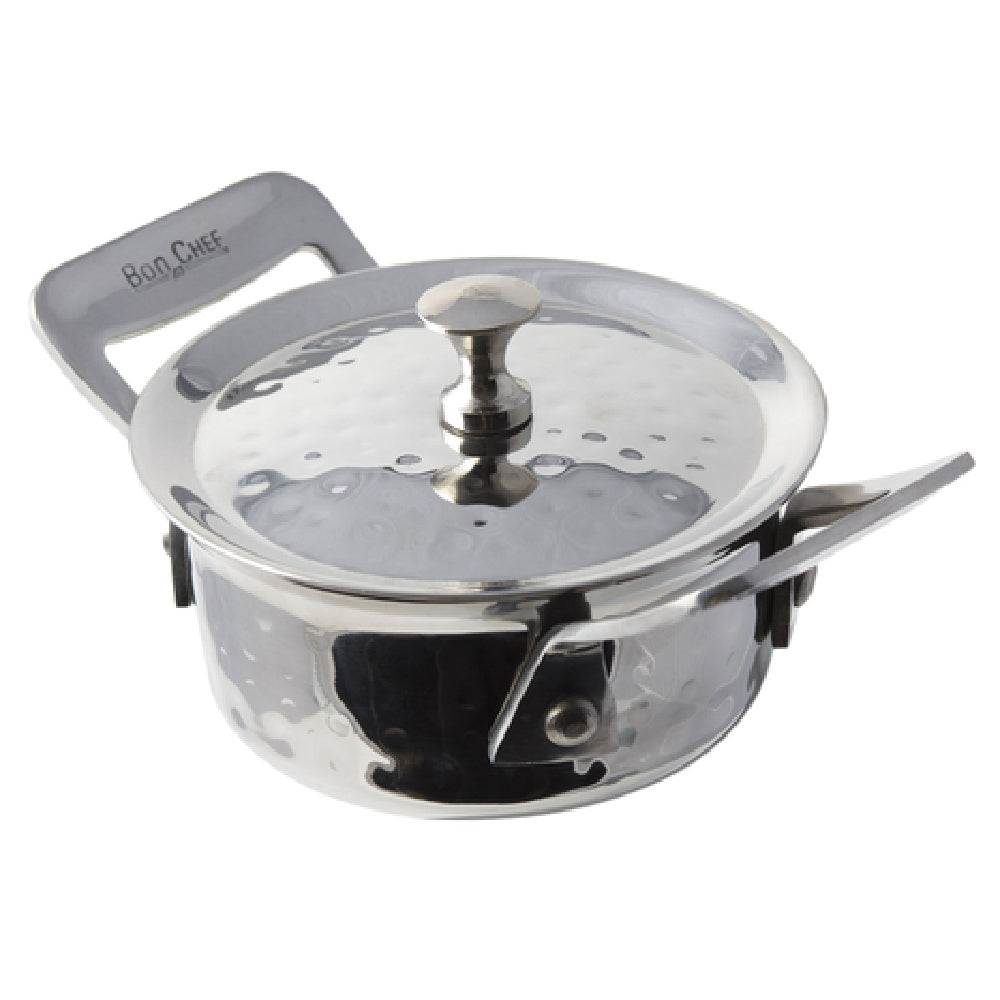 The Bon Chef 60026HF Cucina Dish is an elegantly designed kitchenware item, crafted to enhance both presentation and functionality. With a capacity of 8 oz., this round dish measures 4-1/4" in diameter and stands 1-7/8" tall, ensuring a compact yet ample size for serving various culinary delights. Its design includes two 1" square handles, providing ease of handling and transport within busy kitchen environments. The dish is complemented by a matching lid, which aids in maintaining food temperature and freshness. Made from high-quality stainless steel, it boasts a hammered finish that not only adds a sophisticated touch but also enhances durability and resistance to corrosion. This combination of practicality and aesthetic appeal makes the Bon Chef 60026HF Cucina Dish an ideal choice for professional chefs and home cooks alike, seeking a blend of style and utility in their serveware. Its versatile size and robust construction are particularly suited for a variety of dining settings, from upscale restaurants to intimate home gatherings, making it a valuable addition to any culinary collection.