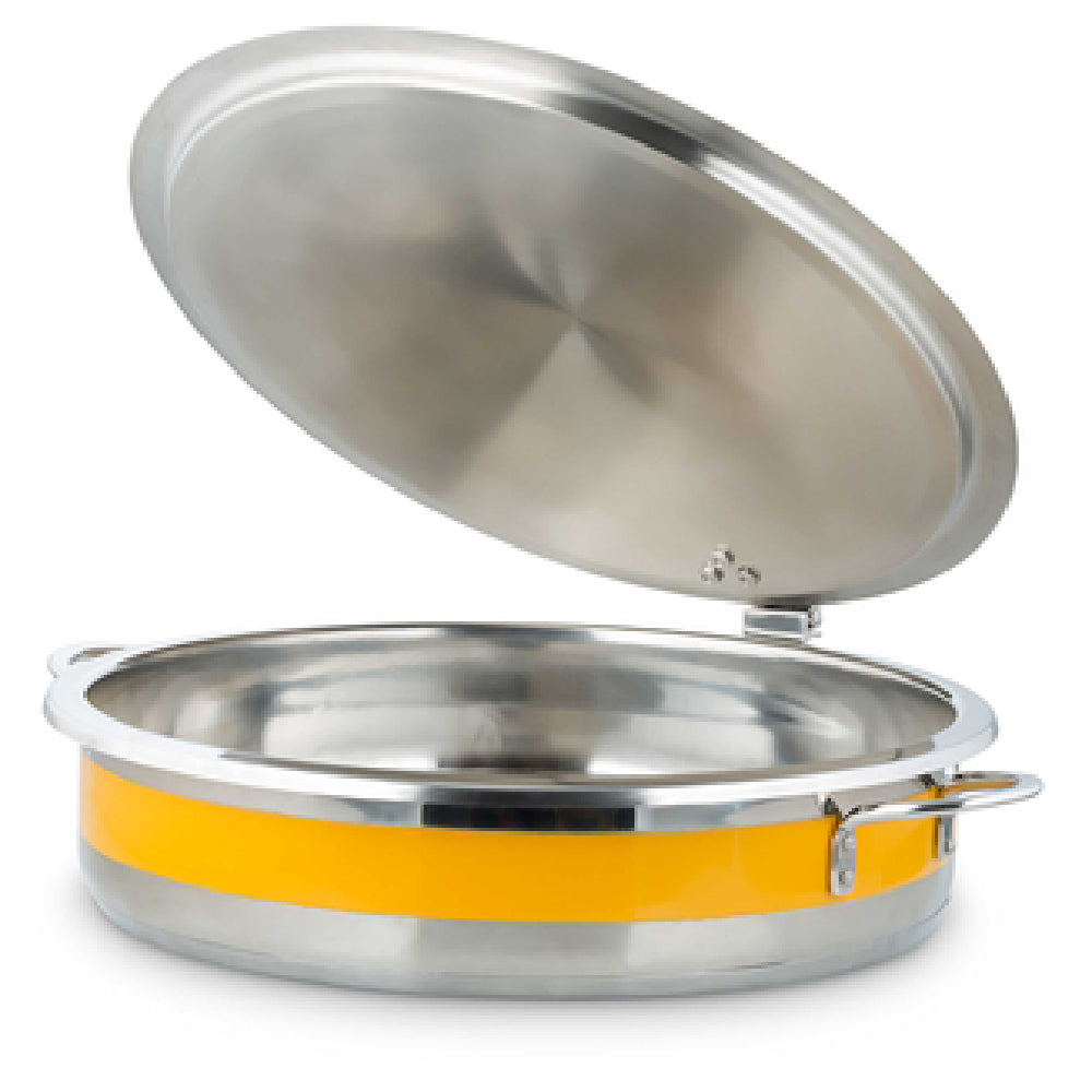 The Bon Chef 60032CFYELLOWHL Classic Country French Pot is a distinguished kitchenware item featuring a substantial 9-quart capacity, ideal for accommodating a wide range of culinary needs from professional kitchens to home-based cooking enthusiasts. With a diameter of 14-3/4 inches and a height of 3-3/8 inches, this round pot is engineered for both form and functionality. It comes equipped with a hinged lid, which enhances its utility by providing convenient access while ensuring contents are securely covered during cooking. The dual 2-inch round handles offer a firm grip, facilitating safe and easy handling. Constructed with high-quality stainless steel, this pot is not only durable but also compatible with induction cooking, thanks to its specially designed induction bottom. Its vibrant yellow finish adds a touch of color to any kitchen setting, while its NSF certification assures compliance with strict public health and safety standards. This classic French pot is an excellent choice for restaurants, catering services, and culinary schools, providing versatility and reliability that caters to the diverse requirements of the food industry sector. Its blend of aesthetic appeal and practical design make it a valuable addition to any kitchen arsenal.