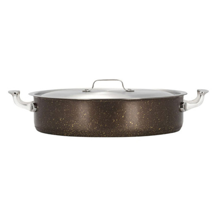 The Bon Chef 60032COFFEE HotStone Cucina Pot is a versatile cooking pot designed for both professional and home kitchens, offering a generous capacity of 9 quarts. With a diameter of 14-3/4 inches and a height of 3-5/8 inches, this round pot includes a cover and features two 2-inch round riveted handles, ensuring safe and convenient handling. Its induction bottom allows for efficient heat distribution, making it an excellent choice for various cooking techniques. The pot is oven safe up to 375°F, expanding its functionality for a range of culinary applications. Constructed from 18/8 stainless steel, it guarantees durability and resistance to corrosion, while its coffee-colored finish adds a touch of elegance to any kitchen setting. The Bon Chef 60032COFFEE HotStone Cucina Pot is ideal for chefs and culinary enthusiasts looking for a high-quality, reliable cooking vessel that meets the demands of both commercial and residential environments, ensuring outstanding performance and longevity in any culinary setting.