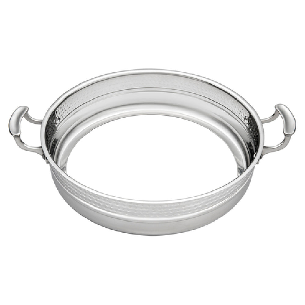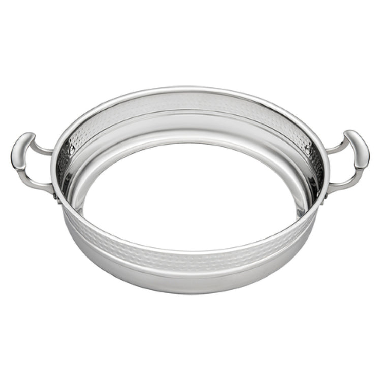The Bon Chef 60032HF-BL Cucina Pot is a distinctive and versatile piece of kitchenware, tailored to meet the diverse needs of culinary professionals. This 9-quart round pot, with a diameter of 14-3/4 inches and a height of 3-3/8 inches, is crafted from high-quality stainless steel, ensuring durability and resistance to corrosion. Its unique hammered finish not only provides an elegant aesthetic but also enhances the pot's heat retention properties, making it perfect for a variety of cooking tasks. The pot's handled design facilitates easy maneuverability, offering convenience in busy kitchen environments. Notably, this pot is bottomless, which could serve specialized functions in particular cooking methods or presentation styles. This feature, combined with its robust construction, makes it an essential tool for chefs who seek both functionality and style in their kitchen equipment. The Bon Chef 60032HF-BL Cucina Pot represents a blend of craftsmanship and practicality, appealing to catering companies, upscale dining establishments, and culinary schools that require reliable and stylish cookware to complement their professional kitchen operations.