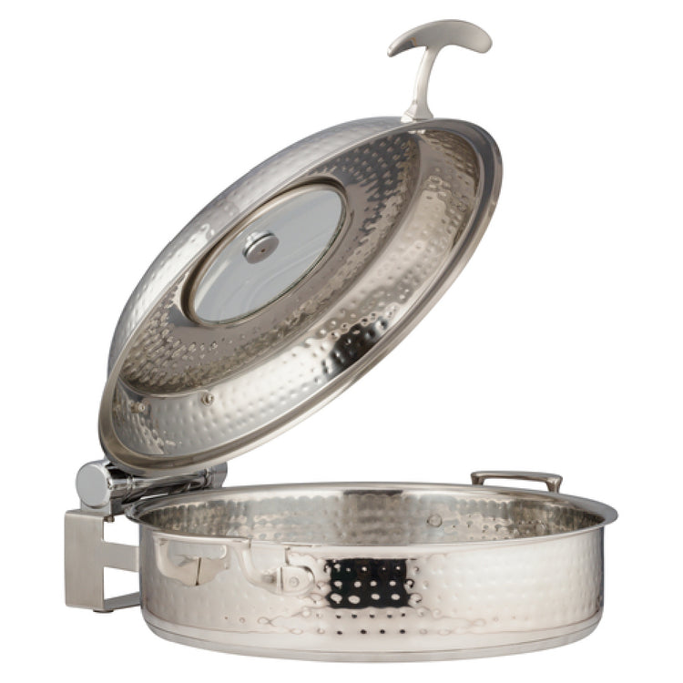 The Bon Chef 60032HFSHL Cucina Pot is a versatile and elegantly crafted kitchen essential, designed to meet the diverse needs of culinary professionals and home cooks alike. With a substantial capacity of 9 quarts, this pot is ideal for preparing large batches of soups, stews, or sauces, accommodating various cooking requirements. Measuring 14-3/4 inches in diameter and 3-3/8 inches in height, its round shape ensures even heat distribution, enhancing cooking efficiency. The pot features a slow down hinged glass lid, allowing for easy monitoring of cooking progress while retaining moisture and flavors. The inclusion of sturdy handles provides secure and comfortable handling, making transport and serving effortless. Engineered with an induction bottom, this Cucina Pot is compatible with modern induction cooktops, expanding its utility across different kitchen setups. Crafted from durable stainless steel, it boasts a striking hammered finish that adds a touch of sophistication to any culinary environment. This combination of functionality and aesthetic appeal makes the Bon Chef 60032HFSHL Cucina Pot a unique value proposition for professionals in the food service industry, as well as for home cooks seeking reliable and stylish cookware.