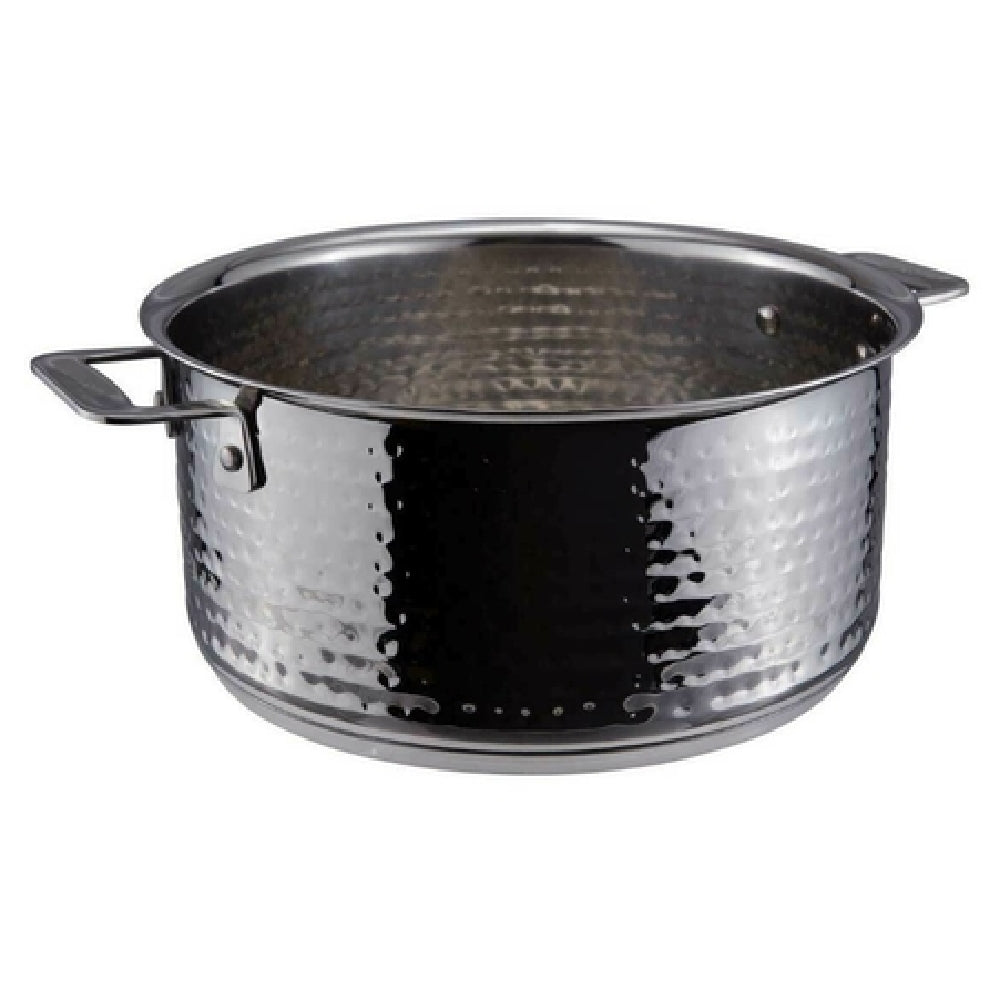 The Bon Chef 60303HF-NC Classic Country French Collection Pot is a versatile kitchen essential, boasting a capacity of 5 quarts and 22 ounces. Its dimensions - 10-1/8 inches in diameter and 4-3/4 inches in height - offer ample space for preparing a variety of dishes. The pot is equipped with two 2-inch round handles, enhancing its functionality and ease of use. Constructed without a cover, this round pot caters to numerous culinary tasks, and its stainless steel composition ensures durability and longevity. Notably, the pot features an induction-ready design, making it a valuable addition to modern, energy-efficient kitchens. The hammered finish adds a touch of elegance, blending traditional aesthetics with contemporary functionality. This pot is ideal for both professional chefs and home cooks who appreciate robust cookware. Its design and materials make it suitable across diverse culinary applications, from simmering stews to cooking grains, offering a reliable cooking solution for various kitchen environments.