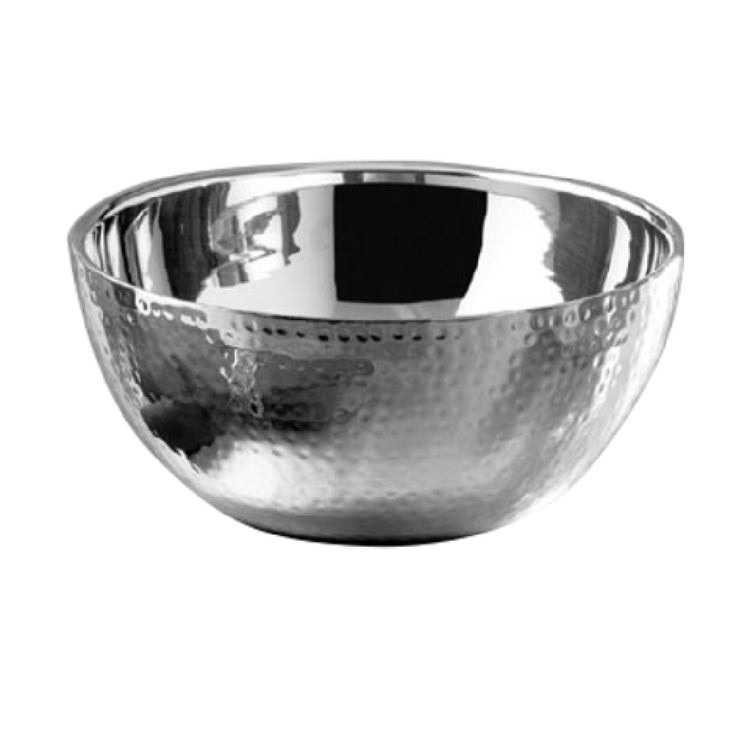 The Bon Chef 61260 Bowl - 3 qt., 9-3/8" dia. x 5" is a meticulously designed piece that caters to the diverse needs of professional kitchens. This round bowl, with its robust 3-quart capacity, is crafted from high-quality stainless steel, ensuring durability and resistance to corrosion. The bowl's dimensions of 9-3/8 inches in diameter and 5 inches in height provide ample space for a variety of culinary applications, from serving to preparation. A standout feature of the Bon Chef 61260 is its double-wall construction, which enhances its thermal retention properties, keeping contents at the desired temperature for extended periods. The hammered finish not only adds an aesthetic appeal but also provides a tactile experience, making it a distinctive addition to any kitchen setting. This bowl is particularly valuable in segment markets that prioritize both functionality and style, such as upscale dining establishments and catering services. Its sturdy construction and elegant design make it an indispensable tool for chefs and culinary professionals who demand both performance and sophistication in their kitchenware.