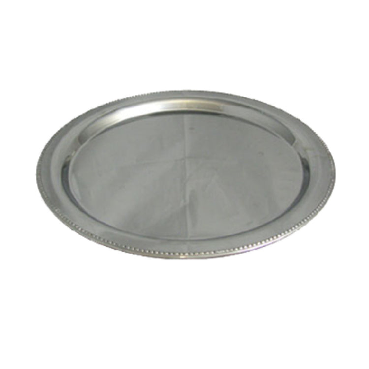 The Bon Chef 61333 Tray - 20" Diameter Round is a masterfully designed serving solution tailored for different segment markets within the food service industry. Crafted from high-quality stainless steel, this round tray offers both durability and an elegant appearance, making it a versatile choice for upscale dining establishments, caterers, and banquet services. The 20-inch diameter provides ample space for serving a variety of dishes, from appetizers to main courses. One of its distinctive features is the bead border, which enhances its aesthetic appeal while also ensuring structural integrity. This design element not only adds a touch of sophistication but also provides a practical function by preventing items from slipping off the edge. The stainless steel construction ensures the tray is resistant to corrosion and easy to clean, making it ideal for frequent use in busy commercial environments. Suitable for both indoor and outdoor events, the Bon Chef 61333 Tray is an essential asset for any food service operation looking to combine style with functionality. Its elegant design and robust build cater to the needs of high-end restaurants as well as large-scale catering events, ensuring that it can withstand the demands of various service settings.